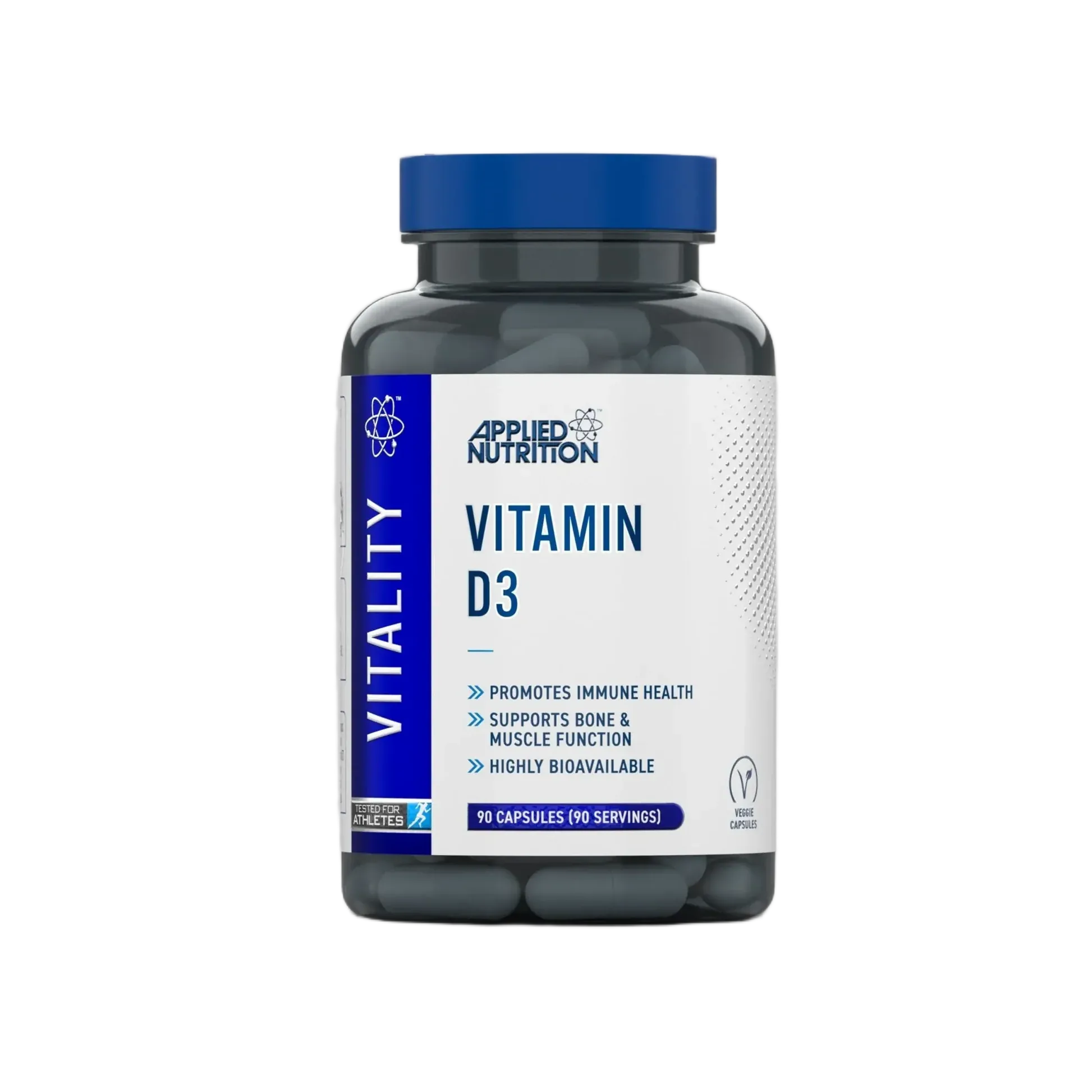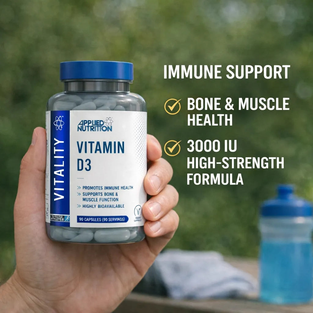 Applied Nutrition Vitality Vitamin D3 is a high-strength vitamin D3 supplement formulated to support normal immune function, bone health, and muscle performance. Each veggie capsule delivers 3000 IU (75 µg) of vitamin D3 (cholecalciferol), the bioavailable form of vitamin D known for enhancing calcium absorption and promoting overall wellbeing.