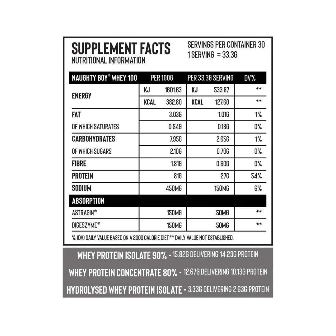 NaughtyBoy Whey 100 is a premium, fully disclosed grass-fed whey protein blend with added AstraGin and DigeZyme. Includes Whey Protein Isolate, Whey Protein Concentrate, and Hydrolysed Whey Protein Isolate.