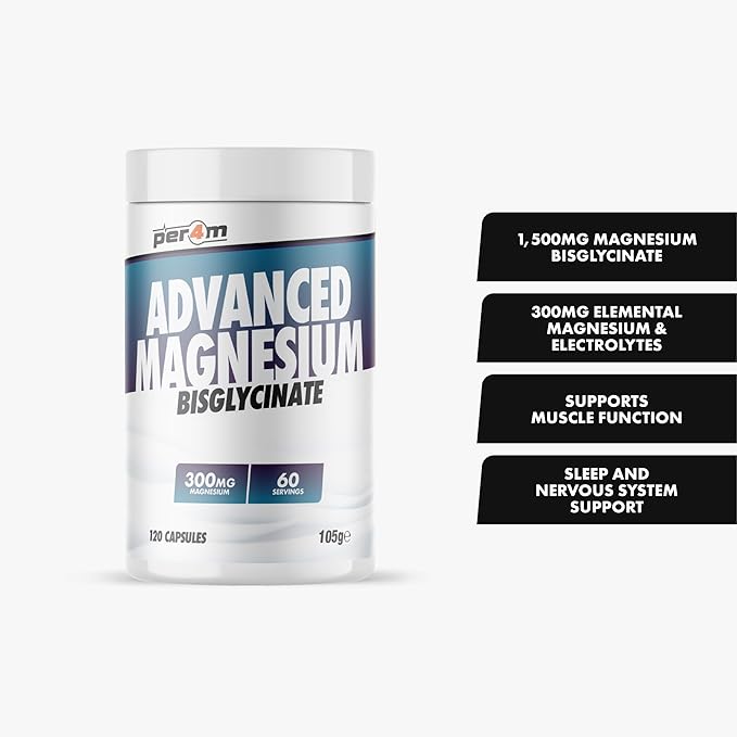 PER4M Advanced Magnesium provides highly bioavailable magnesium to support muscle recovery, nervous system function and restful sleep. The bisglycinate form is bonded to glycine for superior absorption and reduced stomach discomfort, making it ideal for daily use. Perfect for active lifestyles, stress management and overall wellbeing.